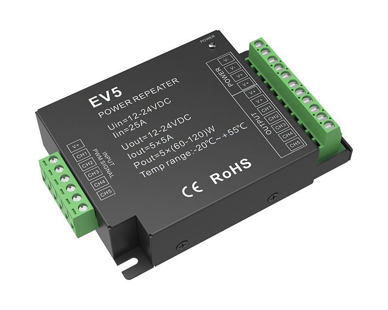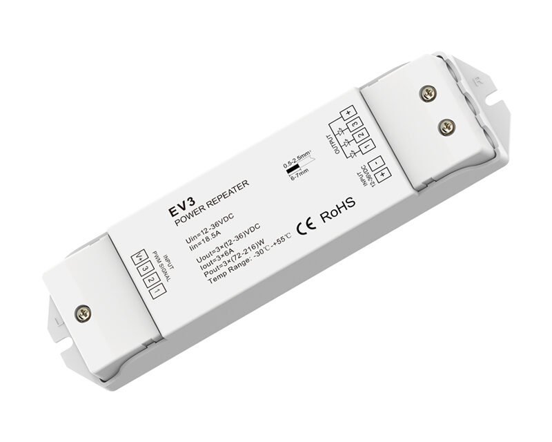 Choosing the right power repeater for LED lighting depends on your system’s voltage type, control method, and lighting scale. In constant voltage LED systems, voltage drop often occurs as distance or load increases, leading to uneven brightness. A power repeater solves this issue by amplifying the PWM (Pulse Width Modulation) signal from the controller, ensuring consistent brightness and synchronized dimming across all connected fixtures.
