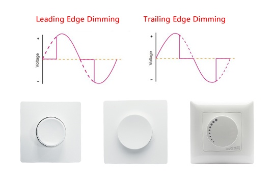 Leading-edge dimmers suit resistive loads. Trailing-edge dimmers handle low-wattage and electronic loads like LEDs much better.